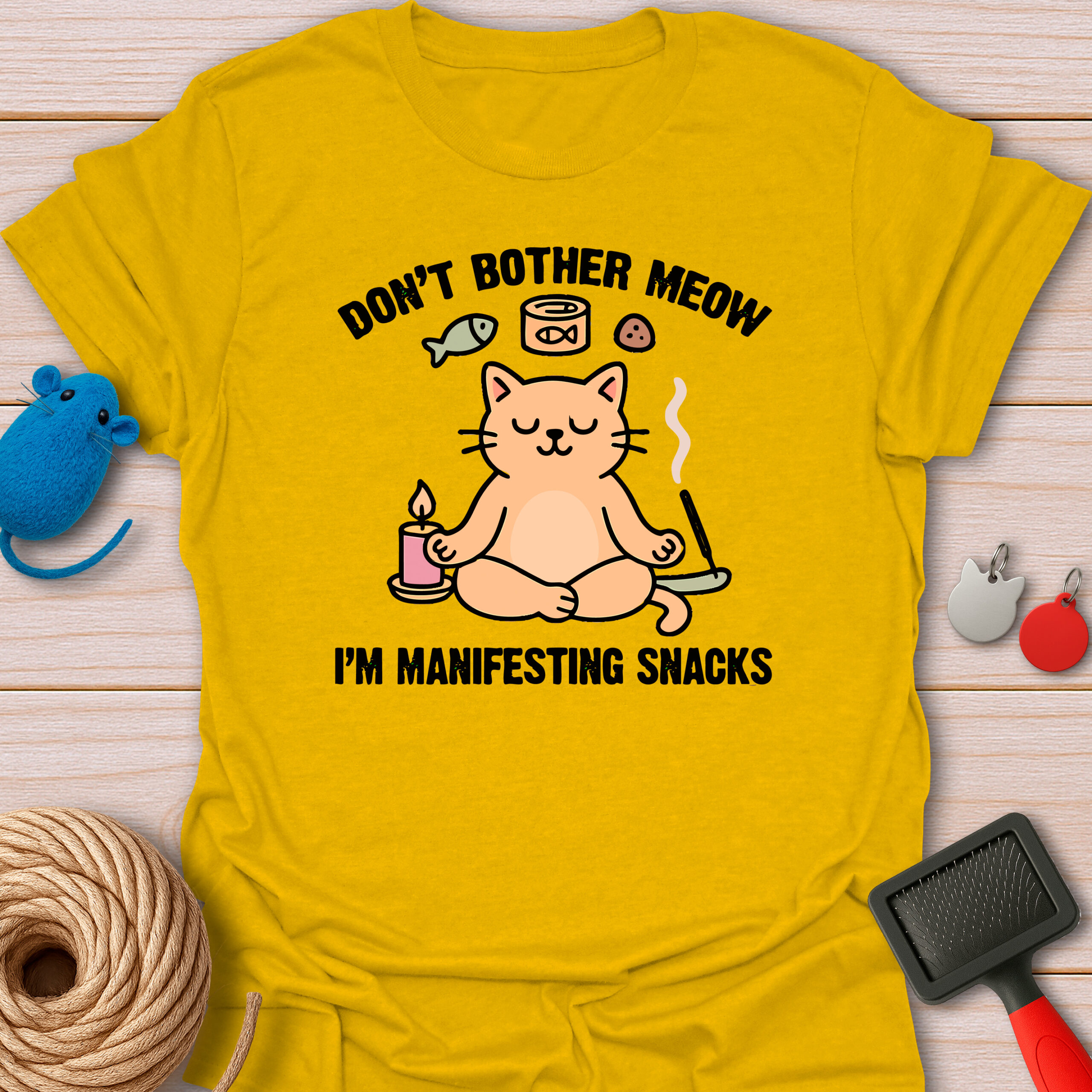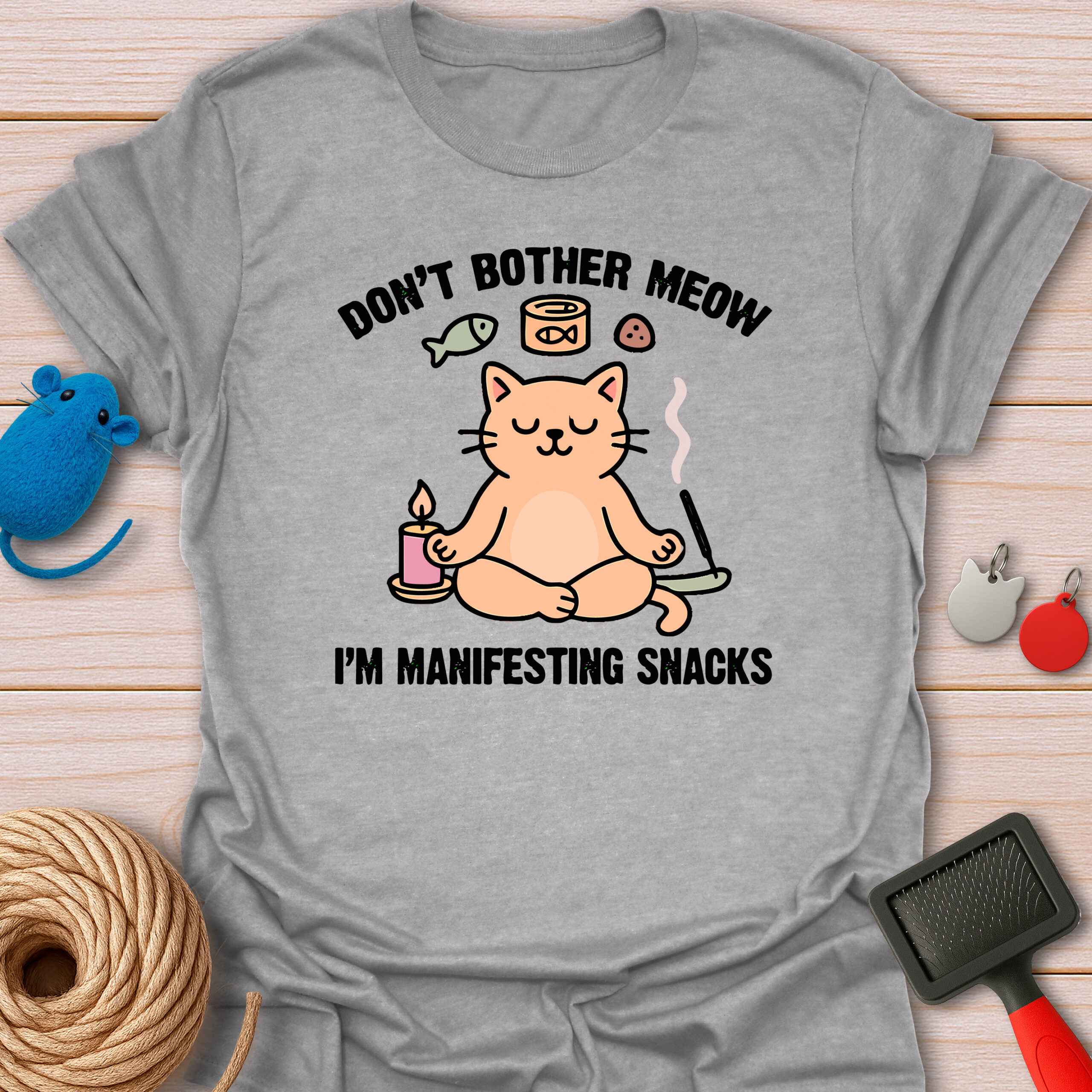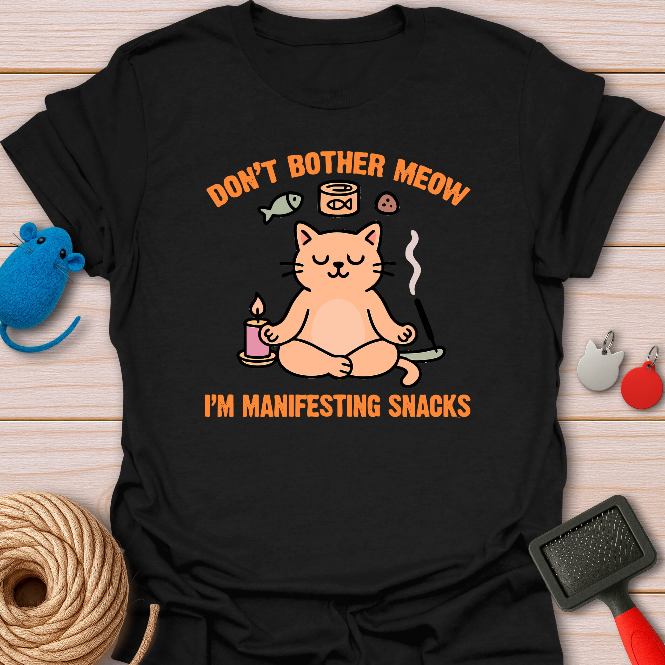 Keywords / Tags: Manifesting snacks, yoga cat shirt, funny meditation tee, cat pun shirt, zen cat, spiritual humor, food lover gift, don't bother meow, cat mom apparel.