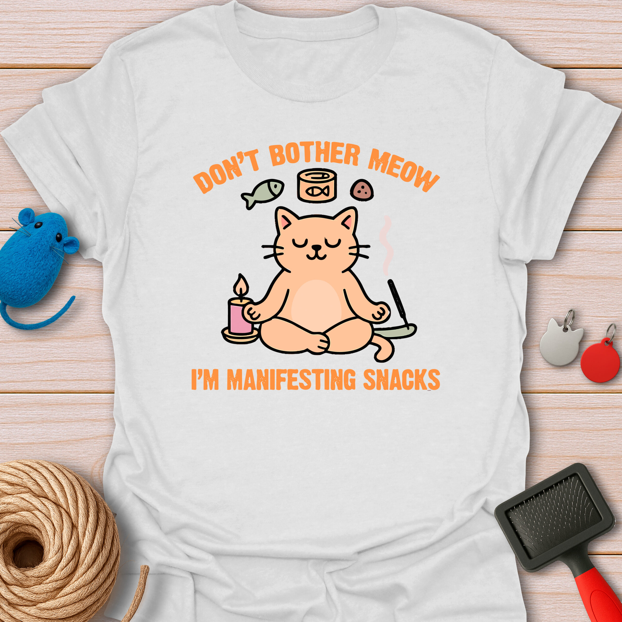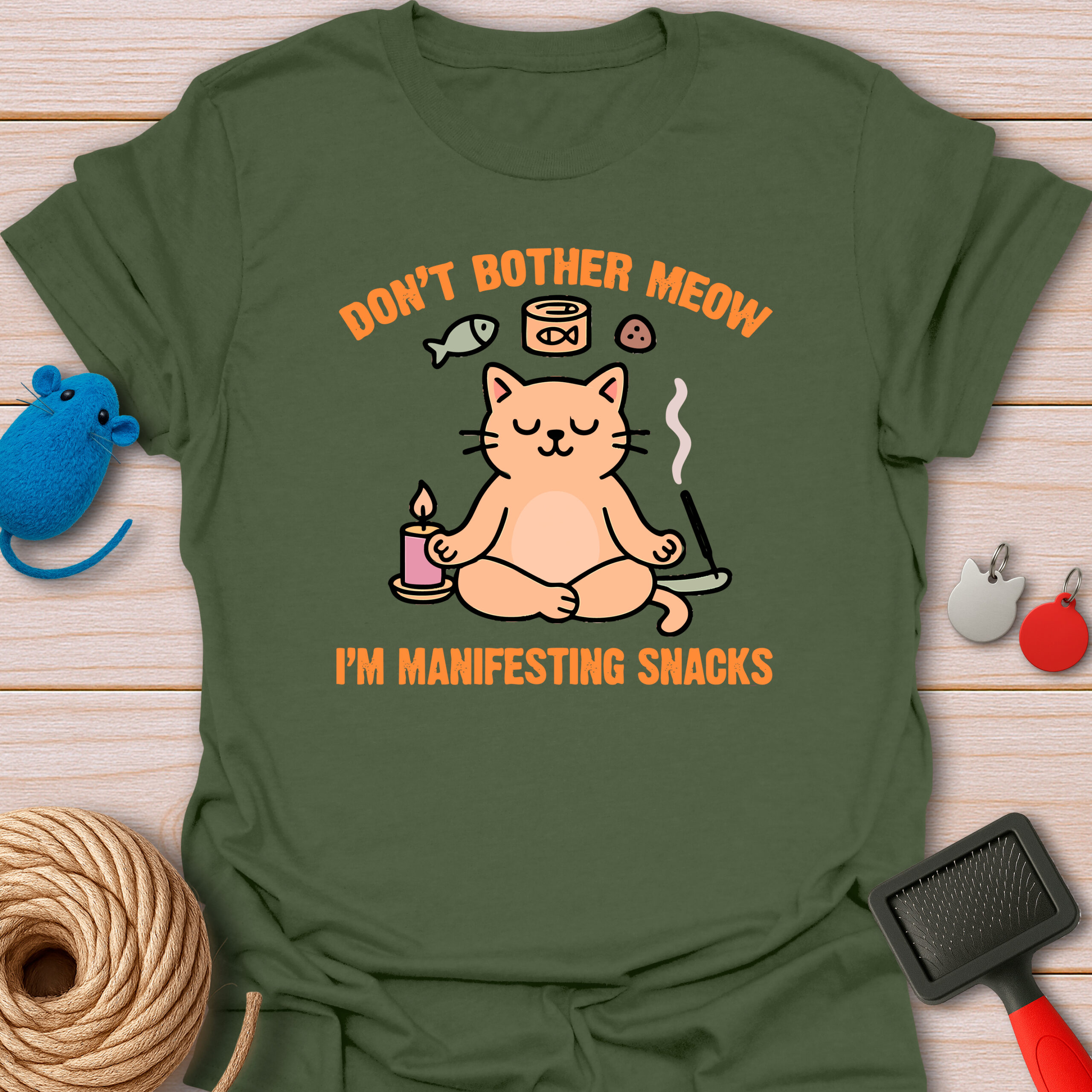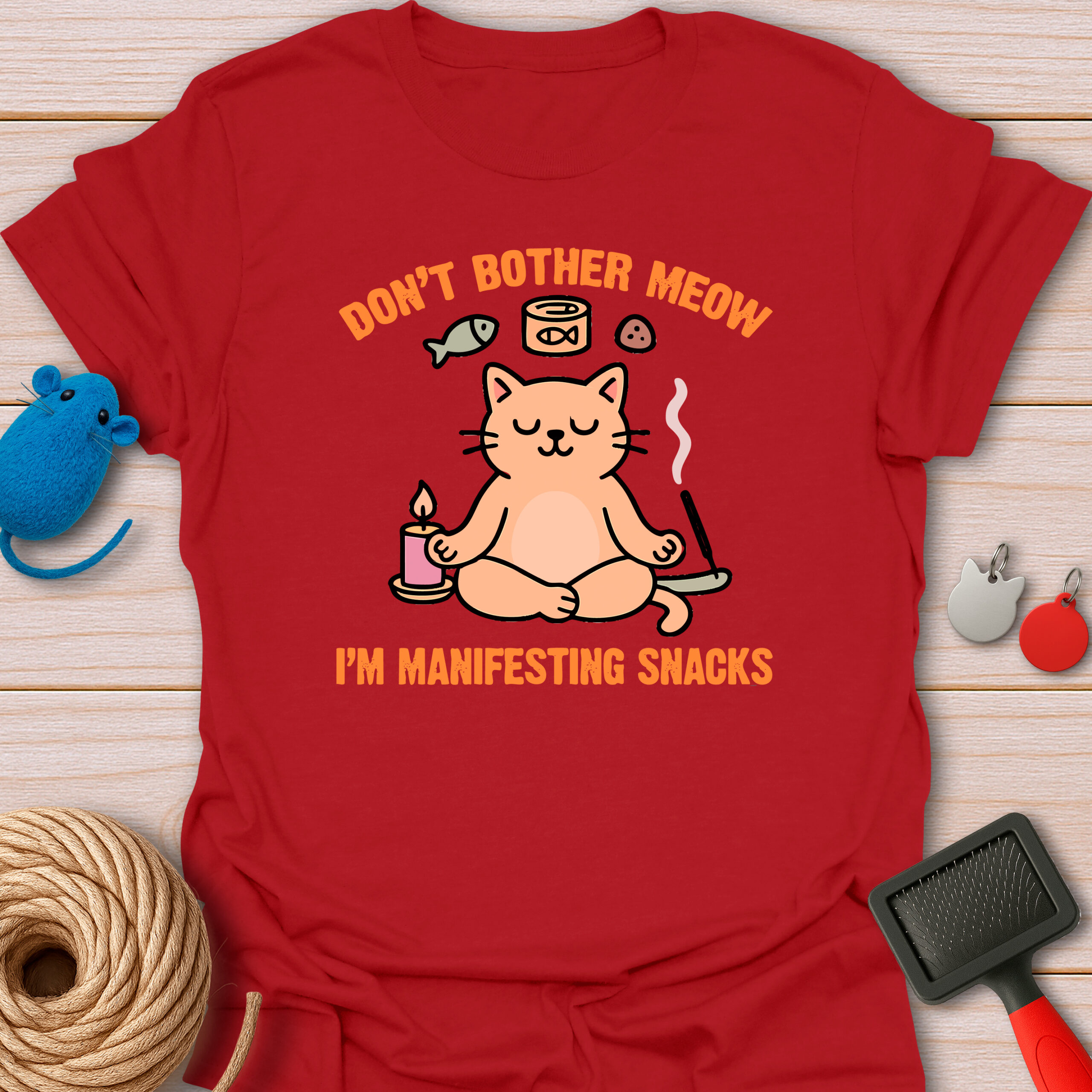 Keywords / Tags: Manifesting snacks, yoga cat shirt, funny meditation tee, cat pun shirt, zen cat, spiritual humor, food lover gift, don't bother meow, cat mom apparel.