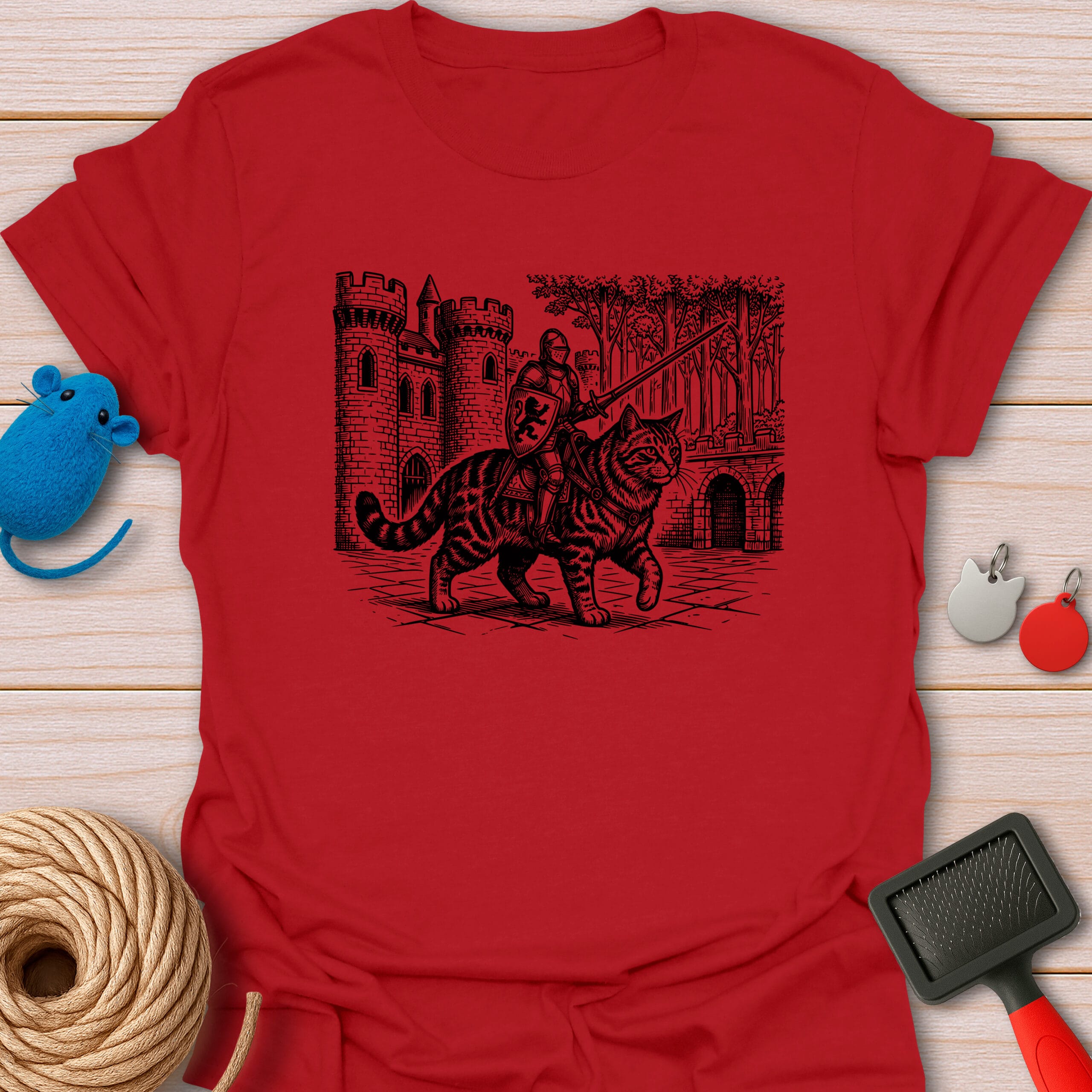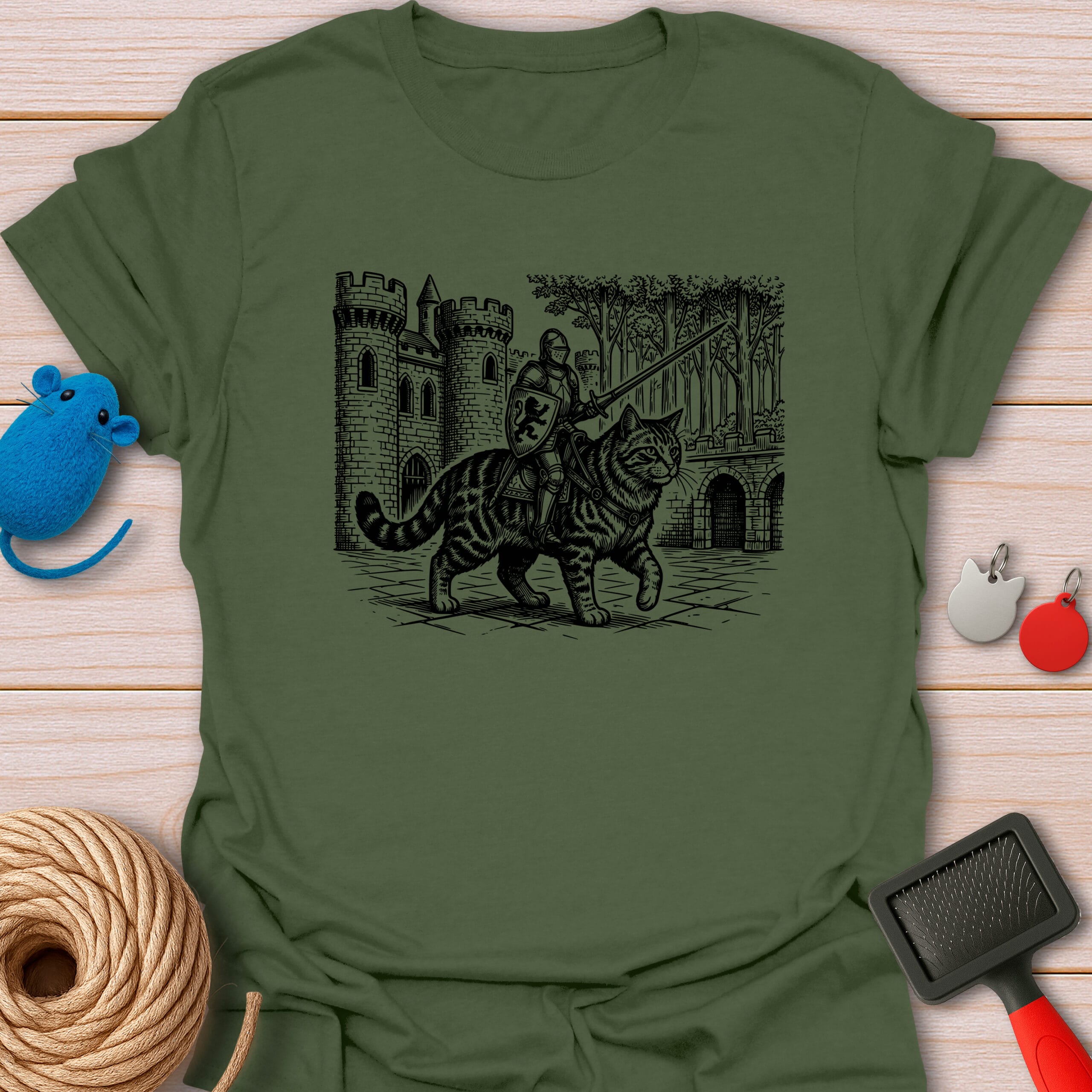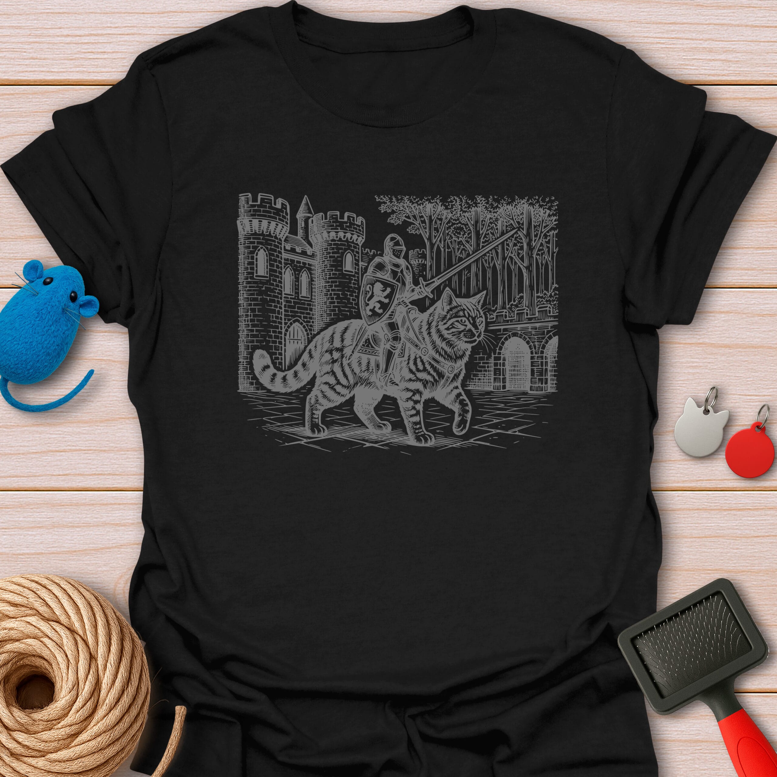 Ready for a meow-gical quest! This epic vintage-style illustration features a brave medieval knight riding a giant tabby cat. The purrfect funny gift for fantasy lovers, gamers, and feline enthusiasts.