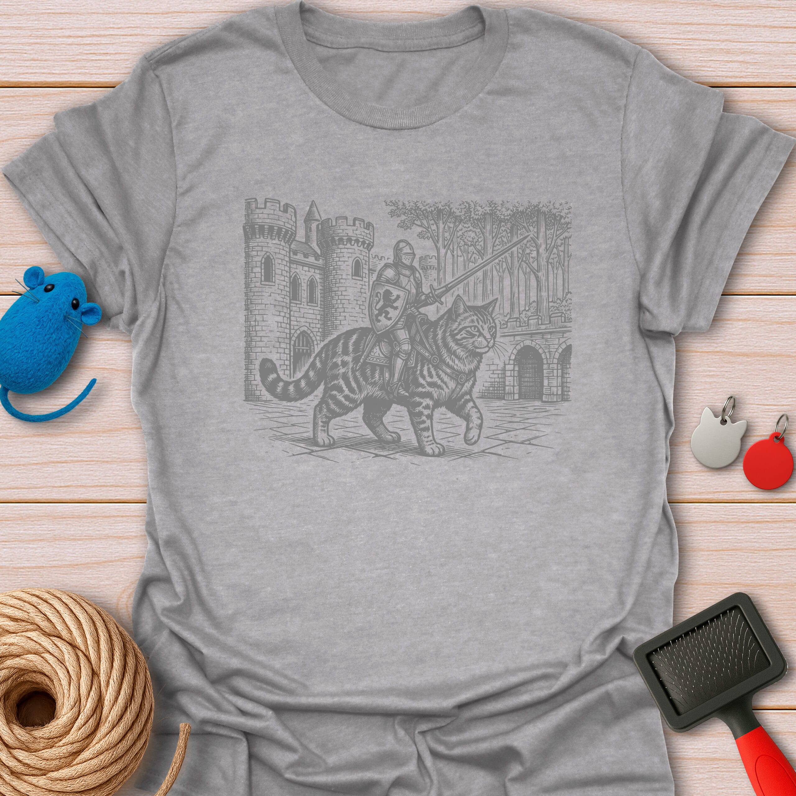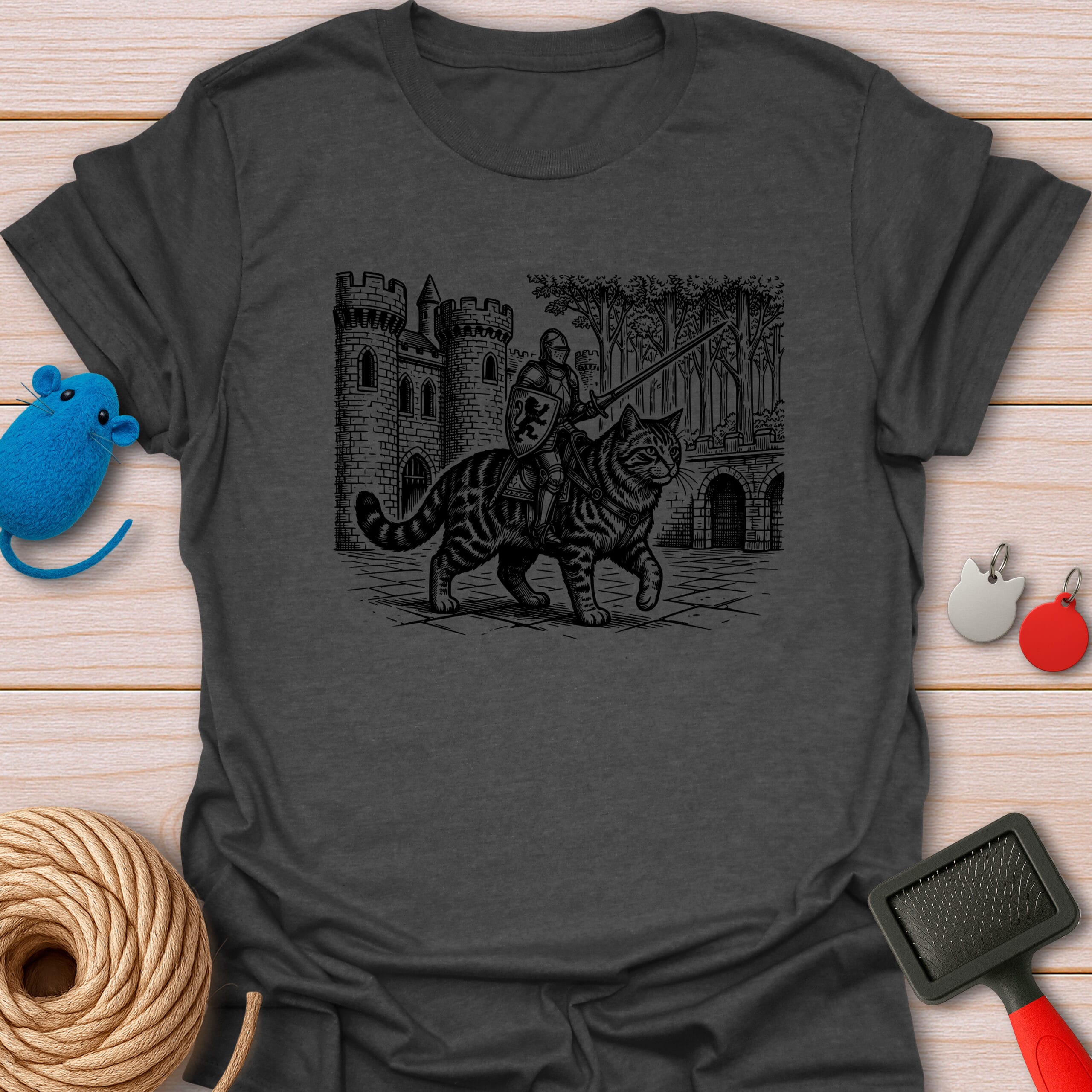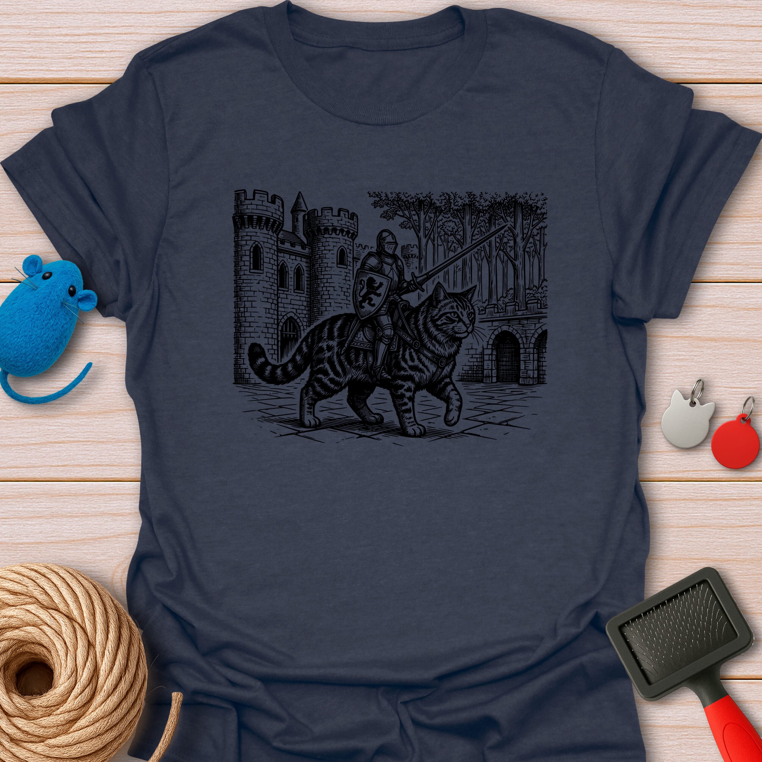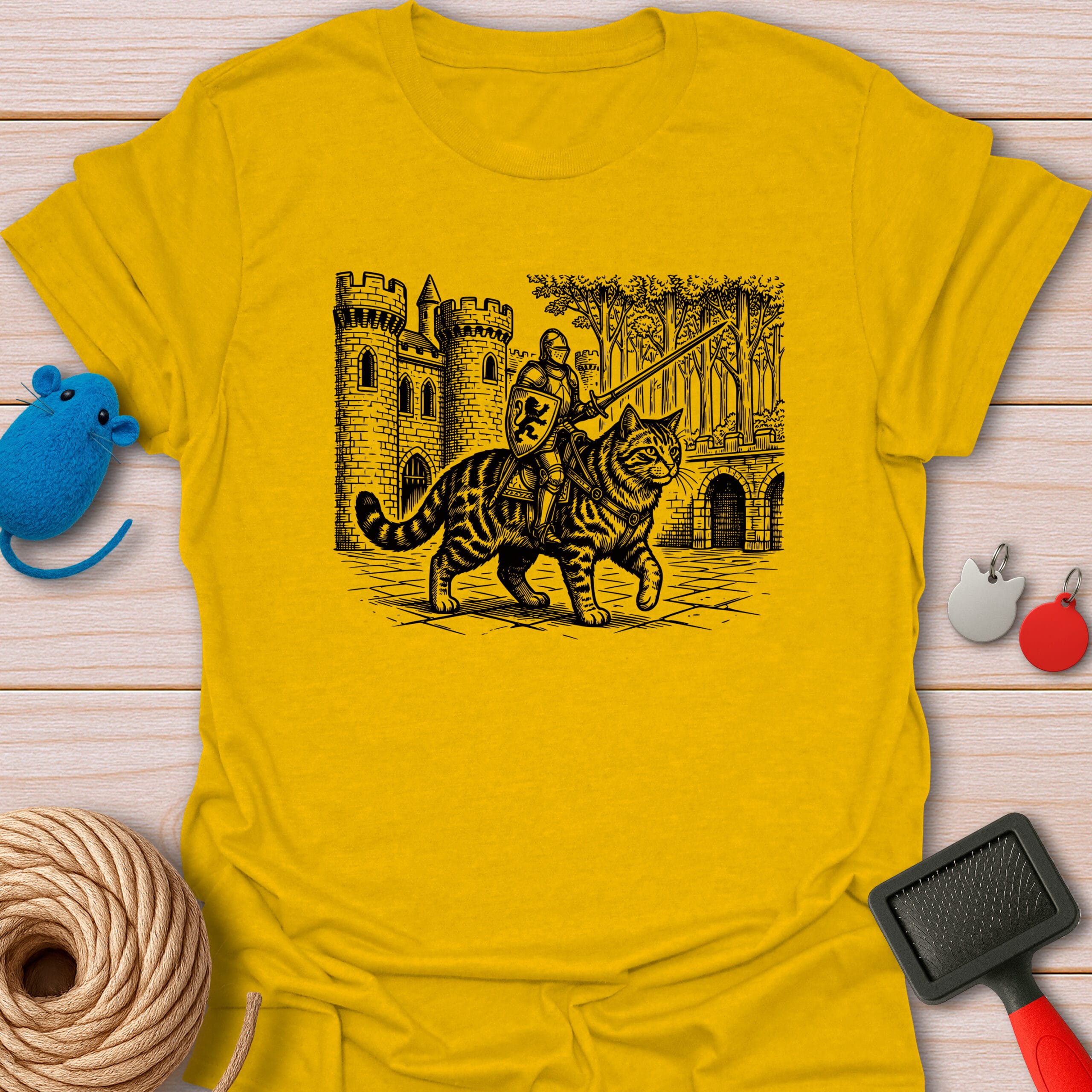 Ready for a meow-gical quest! This epic vintage-style illustration features a brave medieval knight riding a giant tabby cat. The purrfect funny gift for fantasy lovers, gamers, and feline enthusiasts.