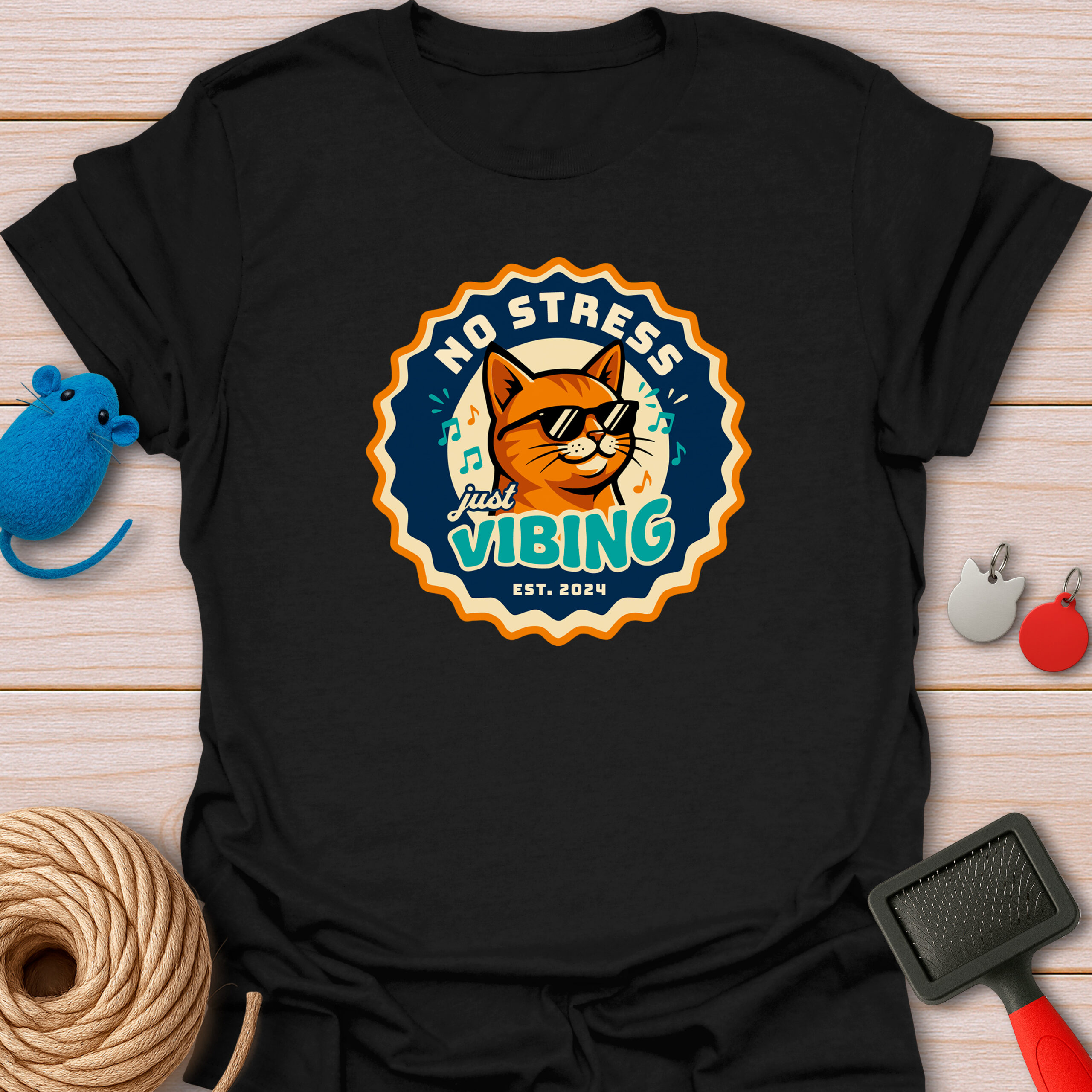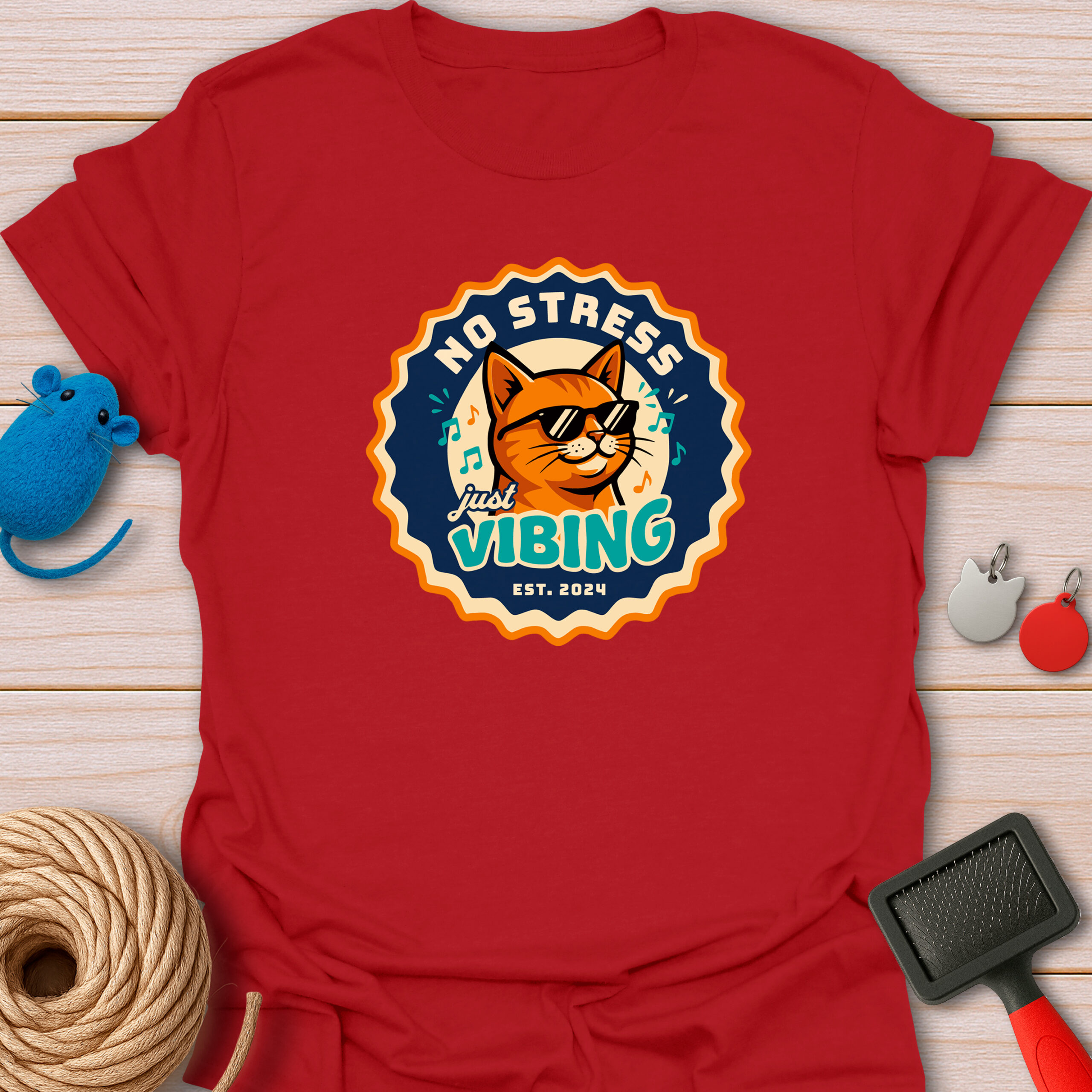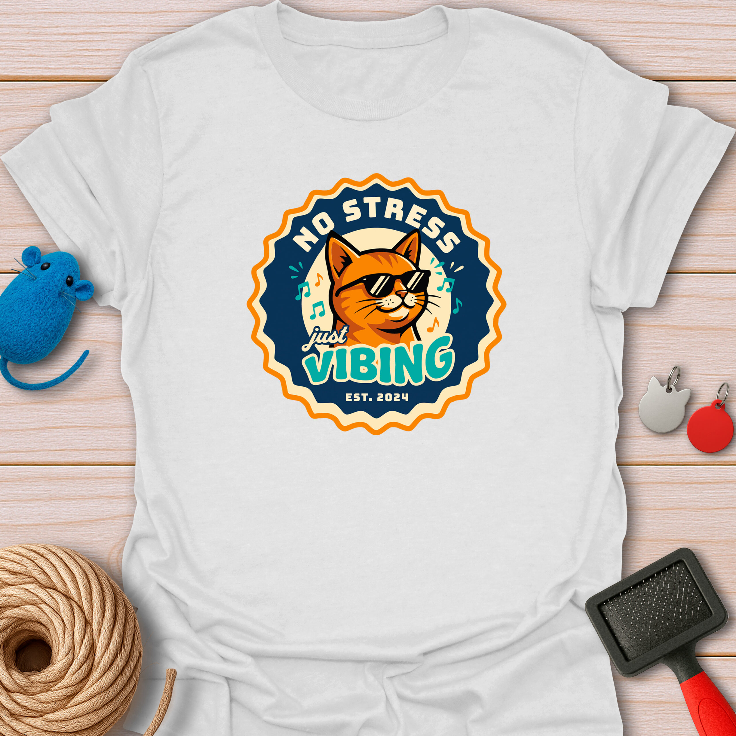 Keywords / Tags: No stress shirt, just vibing cat, retro badge tee, cool cat with sunglasses, music lover gift, funny cat shirt, vintage aesthetic, chill vibes tee, est 2024 shirt.