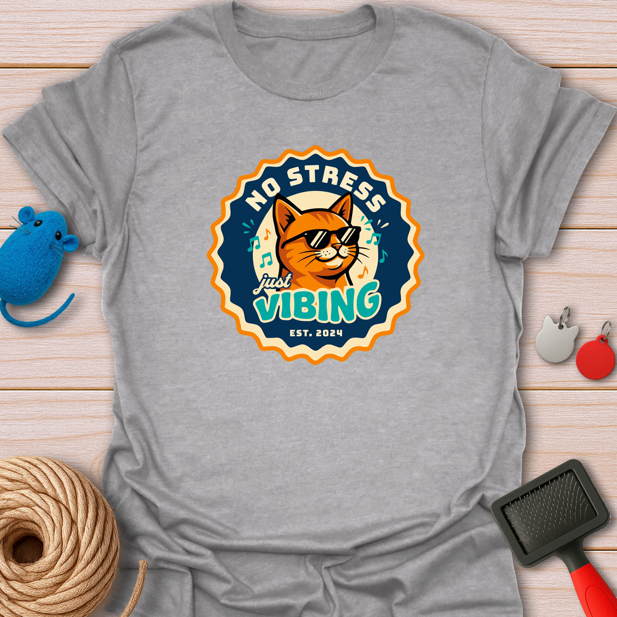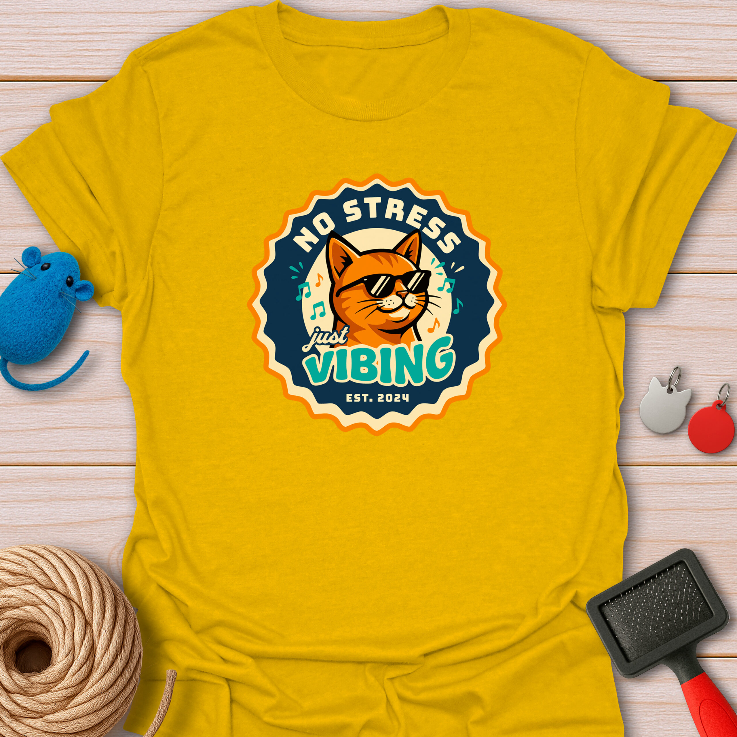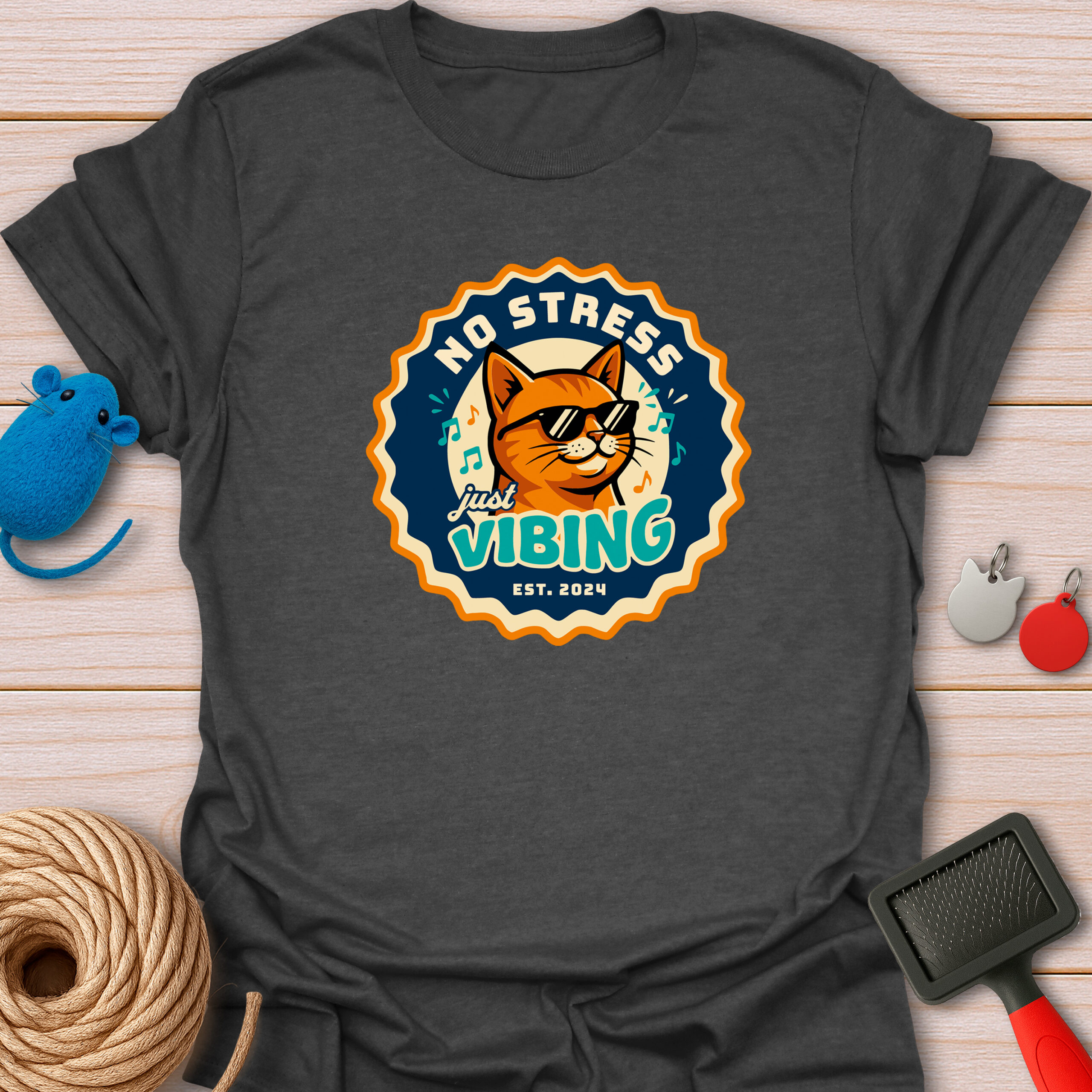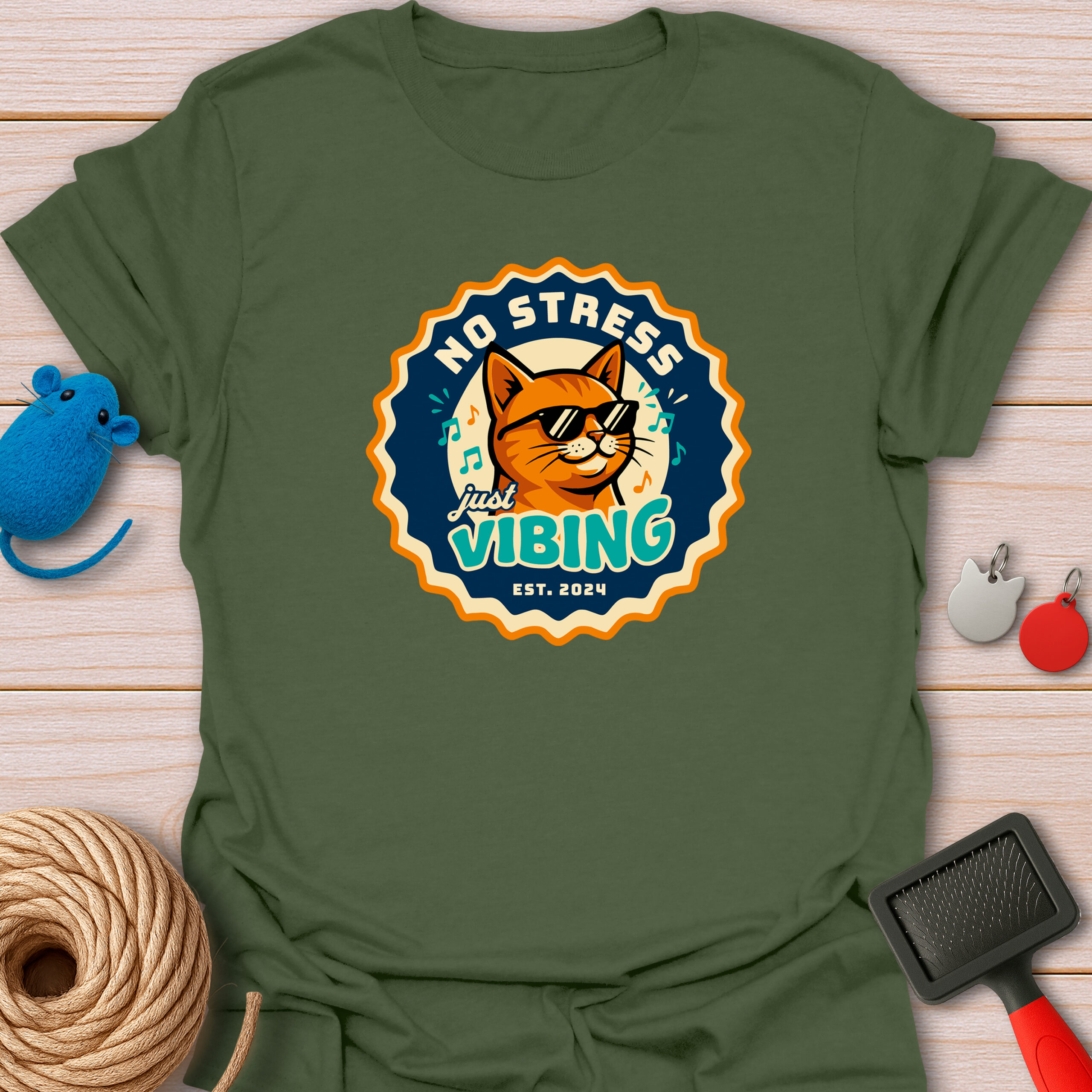 Keywords / Tags: No stress shirt, just vibing cat, retro badge tee, cool cat with sunglasses, music lover gift, funny cat shirt, vintage aesthetic, chill vibes tee, est 2024 shirt.