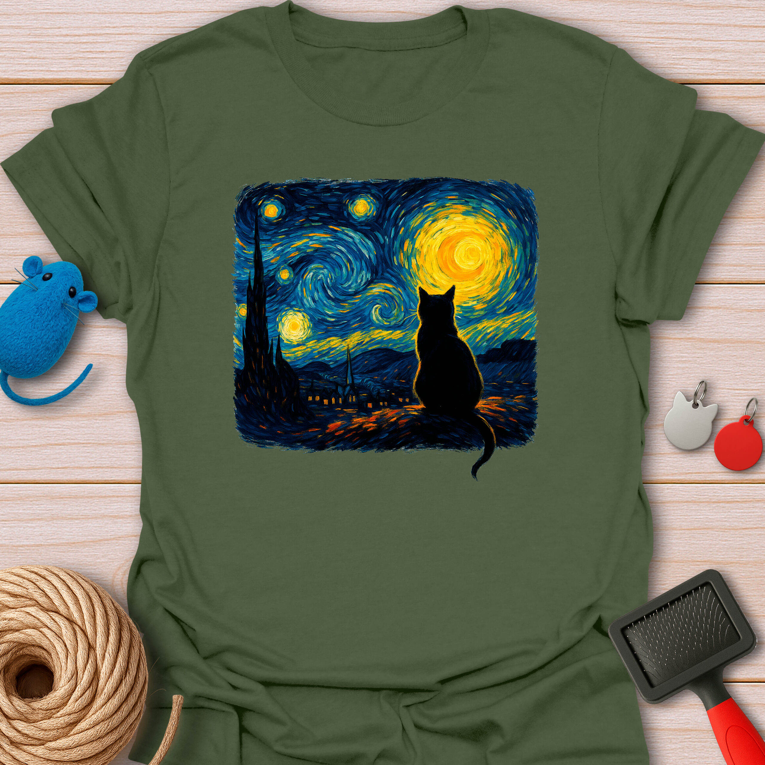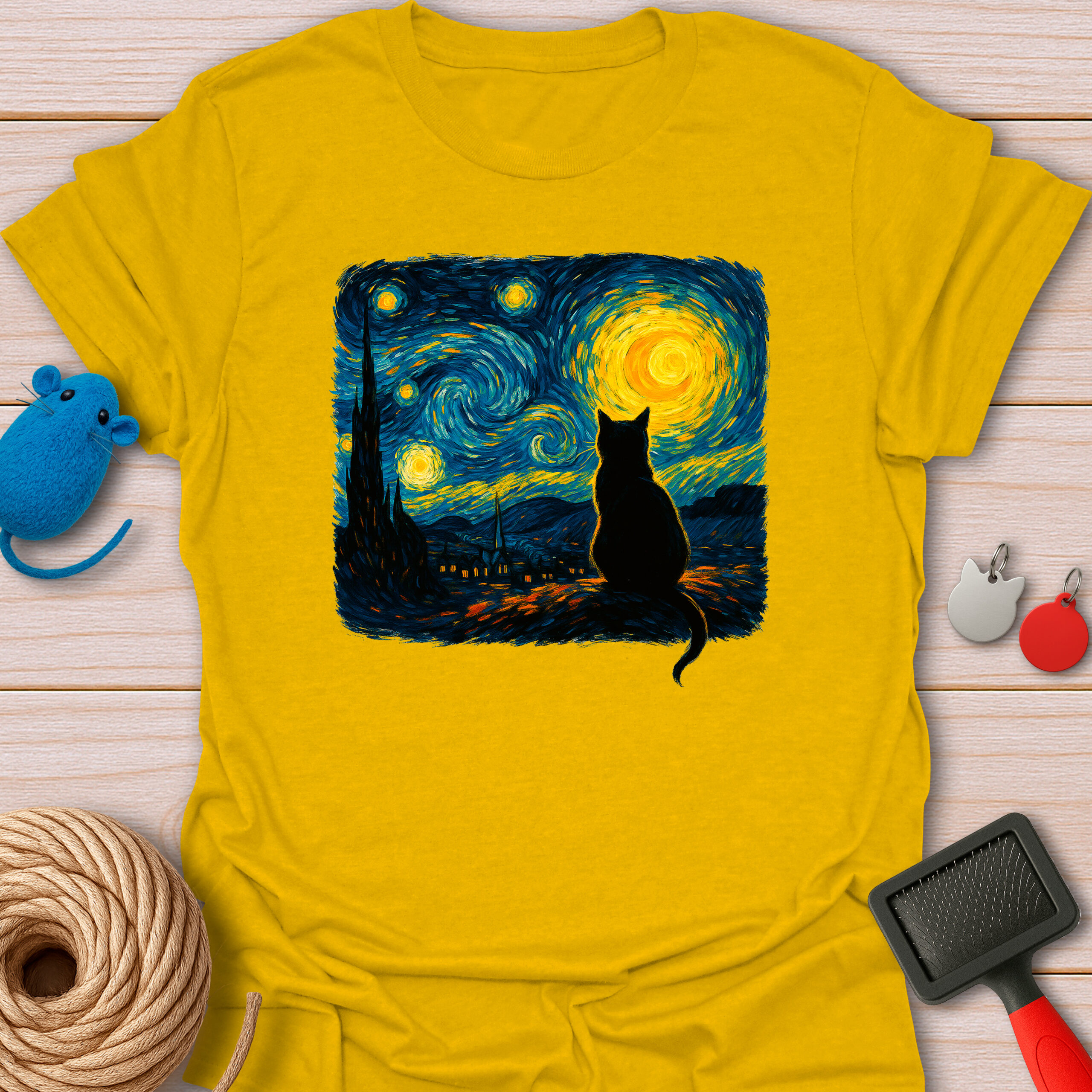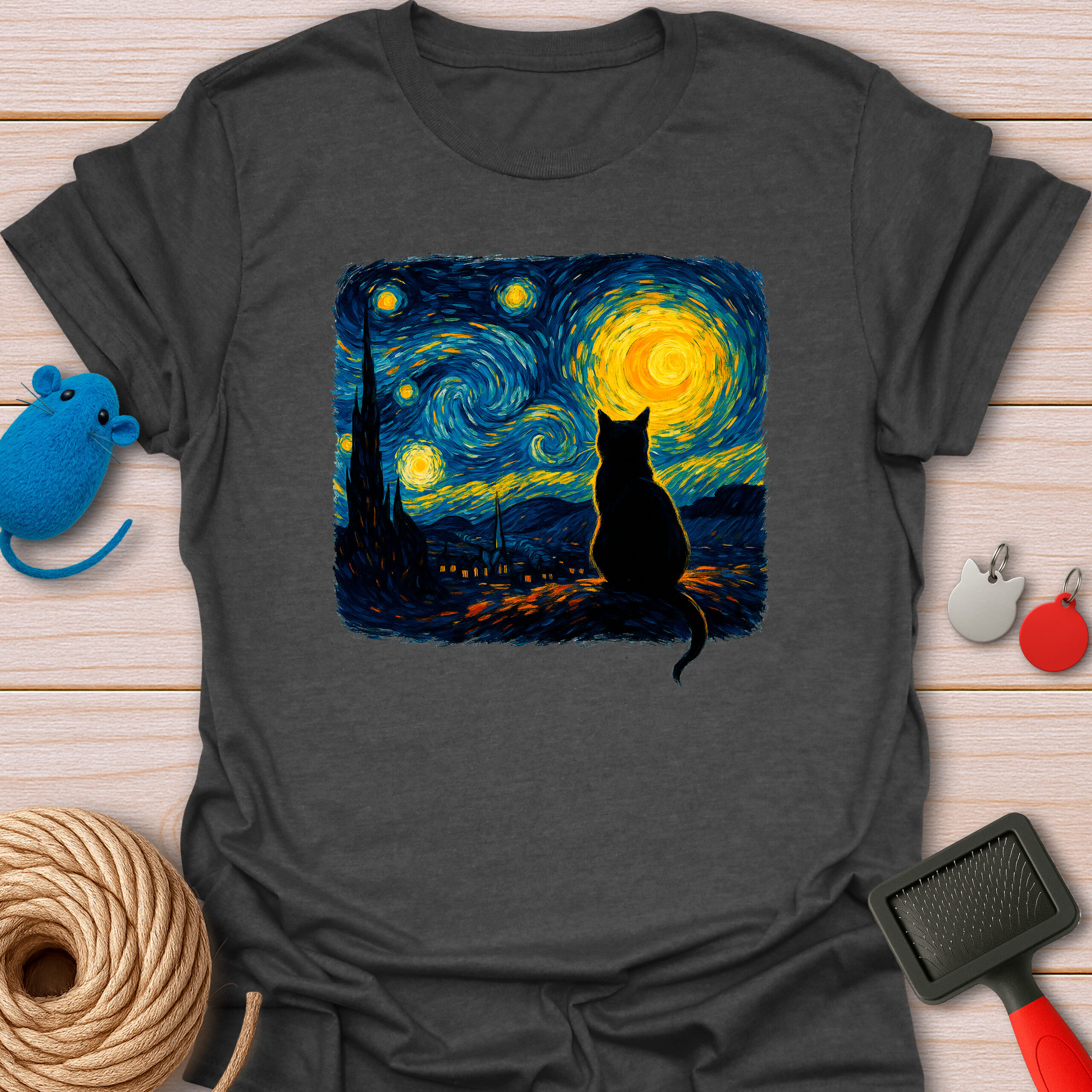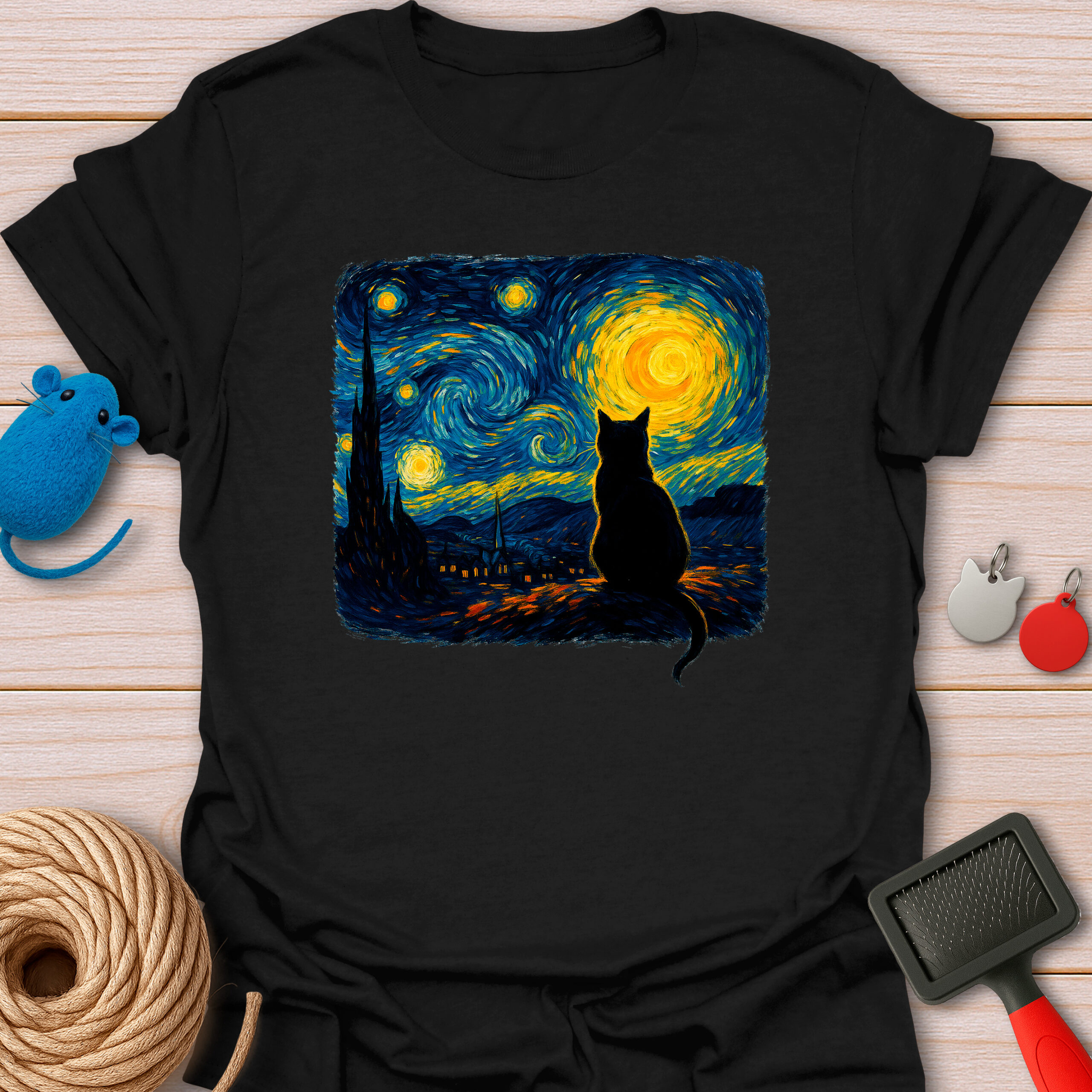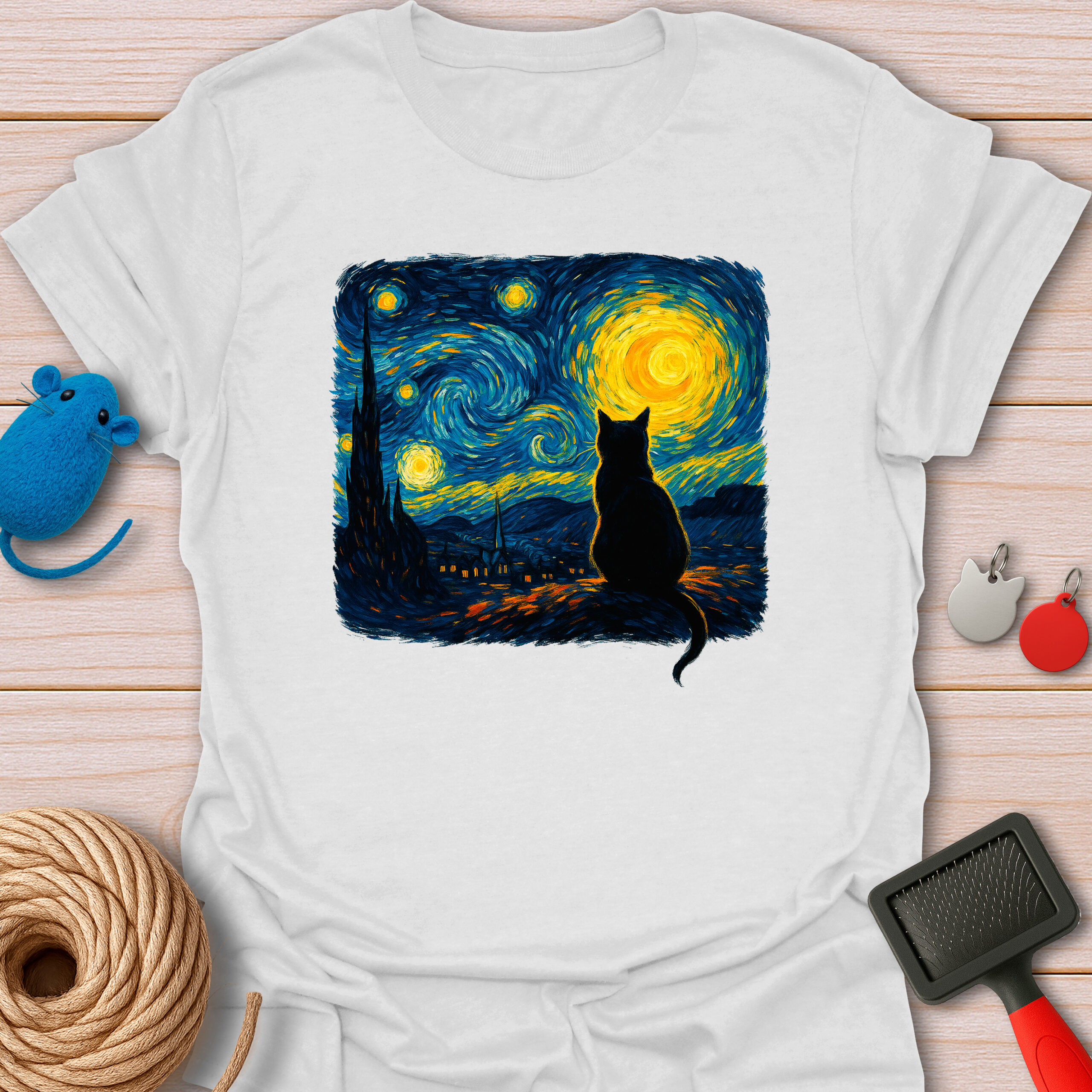 Keywords / Tags: Starry night cat, Van Gogh cat shirt, art lover gift, artistic cat tee, oil painting style, cat silhouette, museum quality art, funny art parody, aesthetic cat shirt.